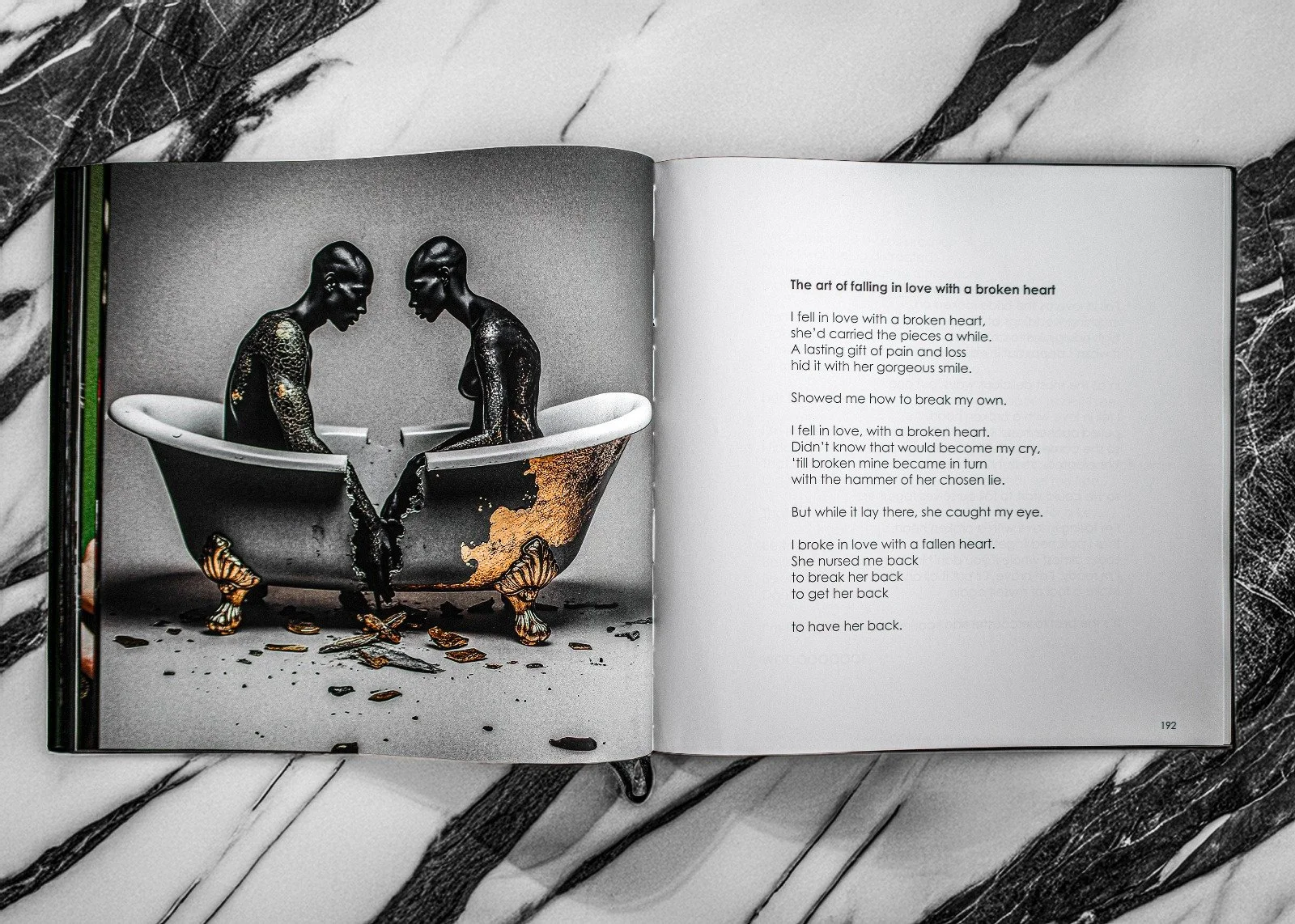 It’s a lay flat hardcover (so poetry and art lie calmly side by side, when opened, all the better to allow them to whisper to each other)